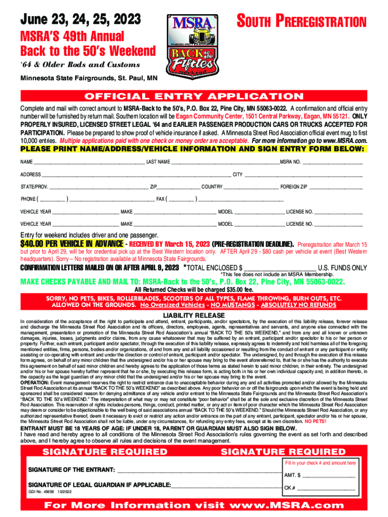 South Preregistration June 23, 24, 25, 2023 MS RAS 49th Annual Back to the 50s Weekend 64 & Older Rods and Customs Minnesota State Fairgrounds, St. Paul, UNOFFICIAL ENTRY APPLICATION Complete and