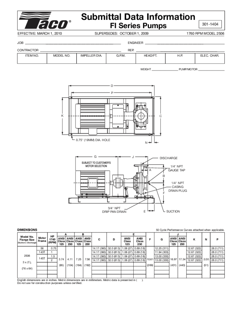 SUPERSEDES: OCTOBER 1, 2009___CONTRACTORMODEL NO.1760 RPM MODEL 2506ENGINEER___ITEM NO.3011404___REP.IMPELLER DID.___G. P.M.HEAD/FT.