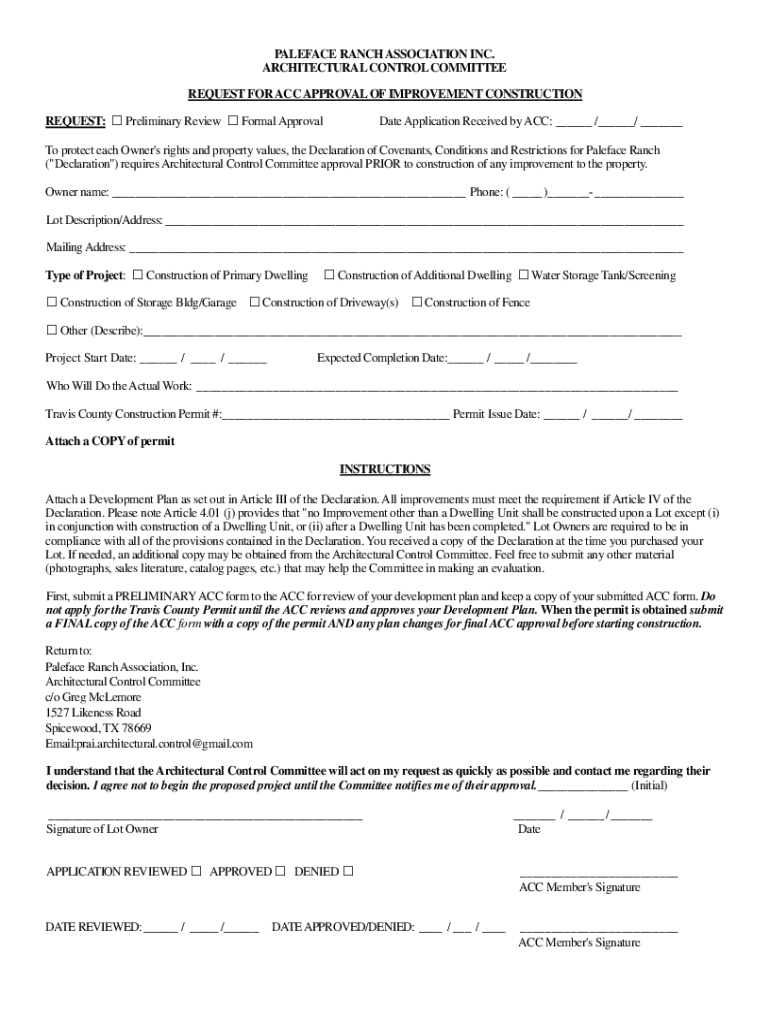 PALEFACE RANCH ASSOCIATION INC. ARCHITECTURAL CONTROL COMMITTEE REQUEST FOR ACC APPROVAL OF IMPROVEMENT CONSTRUCTION REQUEST: Preliminary Review Formal ApprovalDate Application Received by ACC: ___