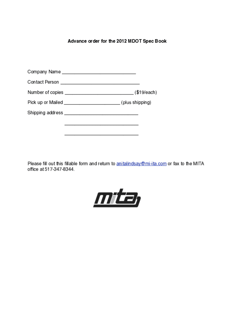 Advance order for the 2012 DOT Spec BookCompany Name ___ Contact Person ___ Number of copies ___ ($19/each) Pick up or Mailed ___ (plus shipping) Shipping address ___ ___ ___Please fill out this fillable