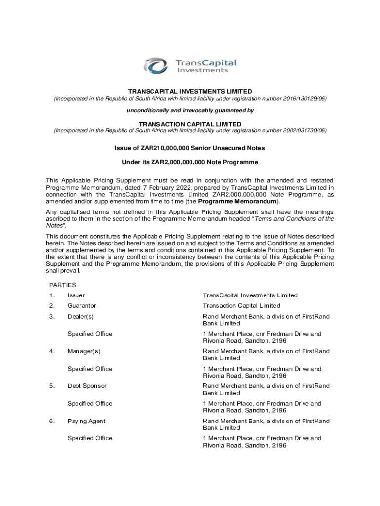 CAN Capital INVESTMENTS LIMITED (Incorporated in the Republic of South Africa with limited liability under registration number 2016/130129/06) unconditionally and irrevocably guaranteed transaction