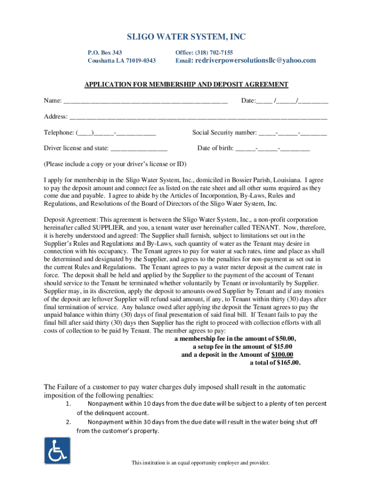 LIGO WATER SYSTEM, INC P.O. Box 343 Couchette LA 710190343Office: (318) 7027155 Email: redriverpowersolutionsllc@yahoo.comAPPLICATION FOR MEMBERSHIP AND DEPOSIT AGREEMENT Name: ___Date:___ /___/___Address: