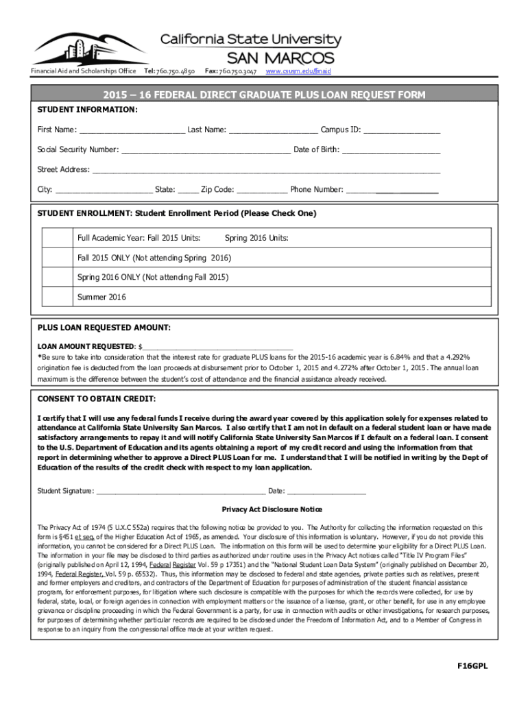 Financial Aid and Scholarships Office: 760.750.4850Fax: 760.750.3047www.csusm.edu/finaid2015 16 FEDERAL DIRECT GRADUATE PLUS LOAN REQUEST FORM STUDENT INFORMATION: First Name: ___ Last Name: ___ Campus