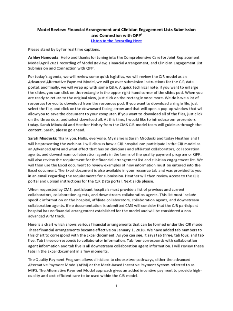 Model Review: Financial Arrangement and Clinician Engagement Lists Submission and Connection with PPP I Listen to the Recording Release stand by for real time captions. Ashley Amount: Hello and thanks