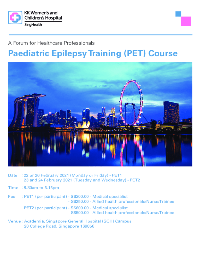 A Forum for Healthcare ProfessionalsPaediatric Epilepsy Training (PET) CourseDate22 or 26 February 2021 (Monday or Friday) PET1 23 and 24 February 2021 (Tuesday and Wednesday) PET2Time8.30am to 5.15pmFeePET1
