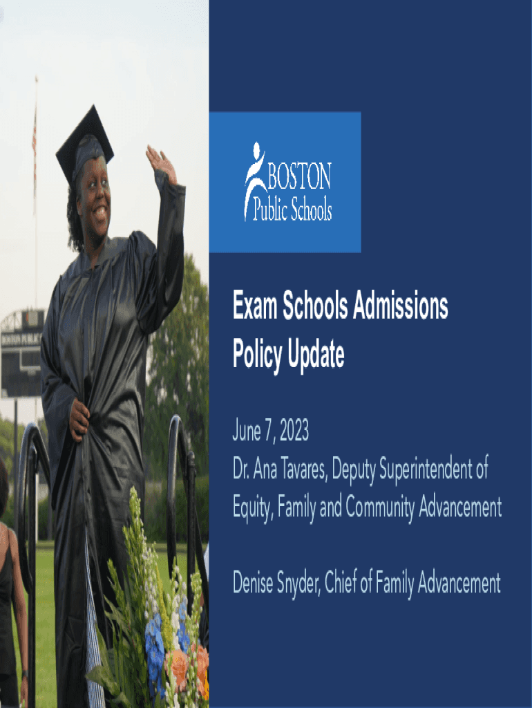 Exam Schools Admissions Policy Update June 7, 2023, Dr. Ana Tavares, Deputy Superintendent of Equity, Family and Community Advancement Denise Snyder, Chief of Family Advancement Key Questions: For