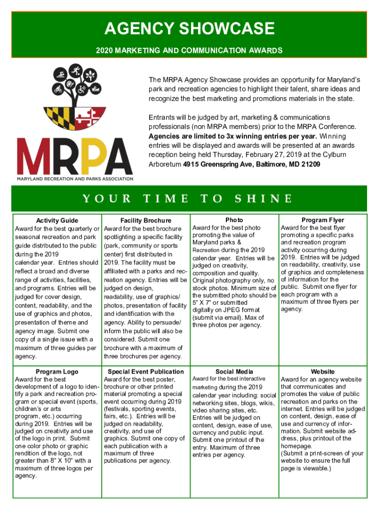 AGENCY SHOWCASE 2020 MARKETING AND COMMUNICATION Awards MPA Agency Showcase provides an opportunity for Maryland spark and recreation agencies to highlight their talent, share ideas and recognize
