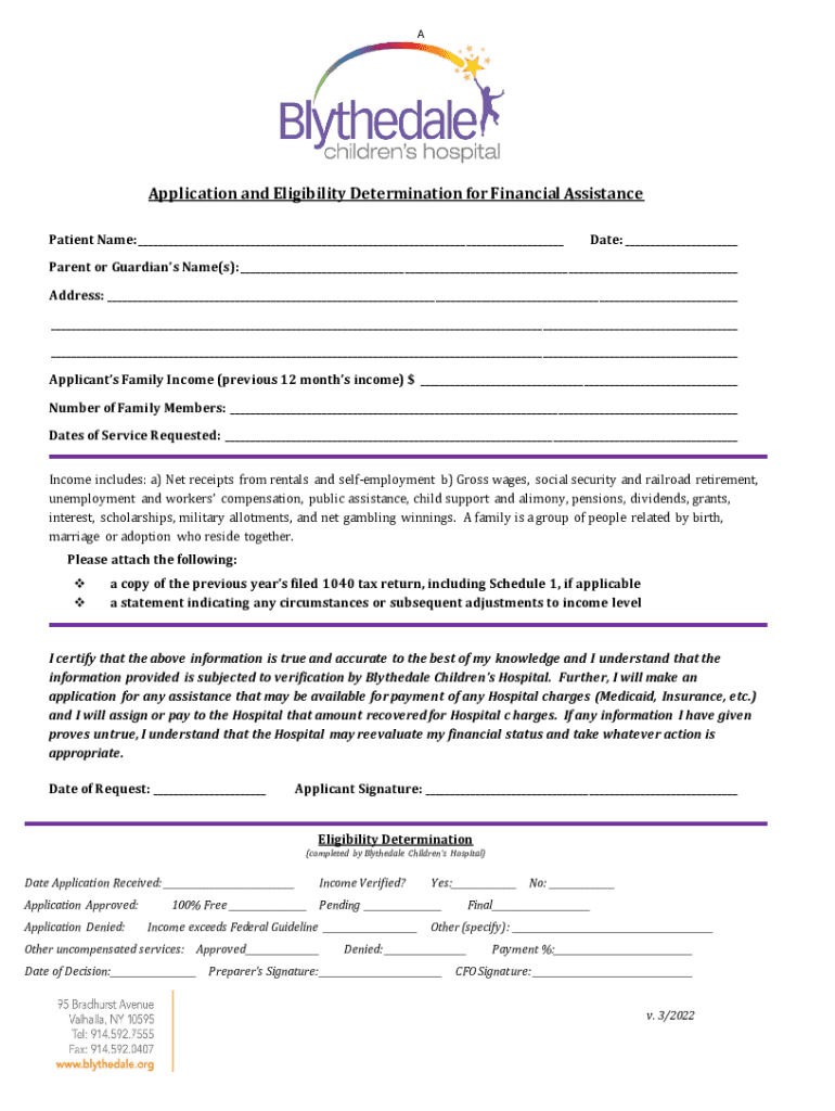 Application and Eligibility Determination for Financial Assistance Patient Name: ___Date: ___Parent or Guardians Name(s): ___ Address: ___ ___ ___ Applicants Family Income (previous 12 months income)