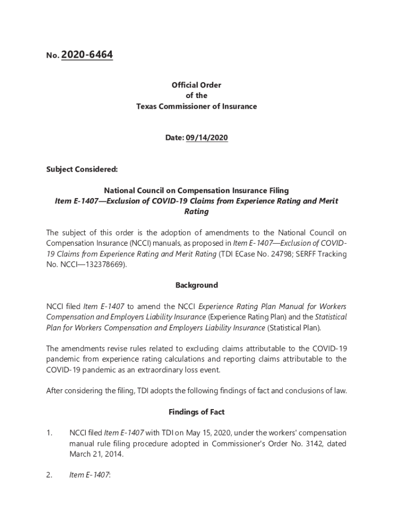No. 20206464 Official Order of the Texas Commissioner of Insurance Date: 09/14/2020 Subject Considered: National Council on Compensation Insurance Filing Item E1407Exclusion of COVID-19 Claims from