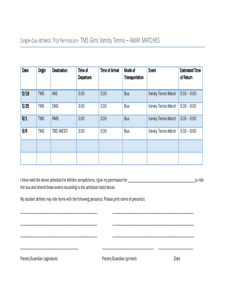 Single Day Athletic Trip Permission TMS Girls Varsity Tennis AWAY MATCHESDateOriginDestinationTime of DepartureTime of ArrivalMode of TransportationEventEstimated Time of Return5/18TMSIMS3:003:30BusVarsity