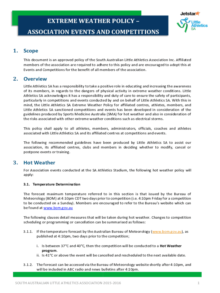 EXTREME WEATHER POLICY ASSOCIATION EVENTS AND COMPETITIONS 1. Scope This document is an approved policy of the South Australian Little Athletics Association Inc. Affiliated members of the association
