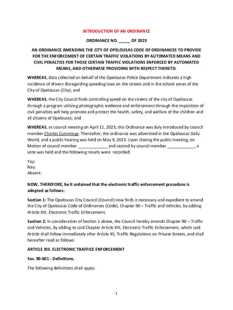 INTRODUCTION OF AN ORDINANCE NO. ___ OF 2023 AN ORDINANCE AMENDING THE CITY OF DELOUSES CODE OF ORDINANCES TO PROVIDE FOR THE ENFORCEMENT OF CERTAIN TRAFFIC VIOLATIONS BY AUTOMATED MEANS AND CIVIL