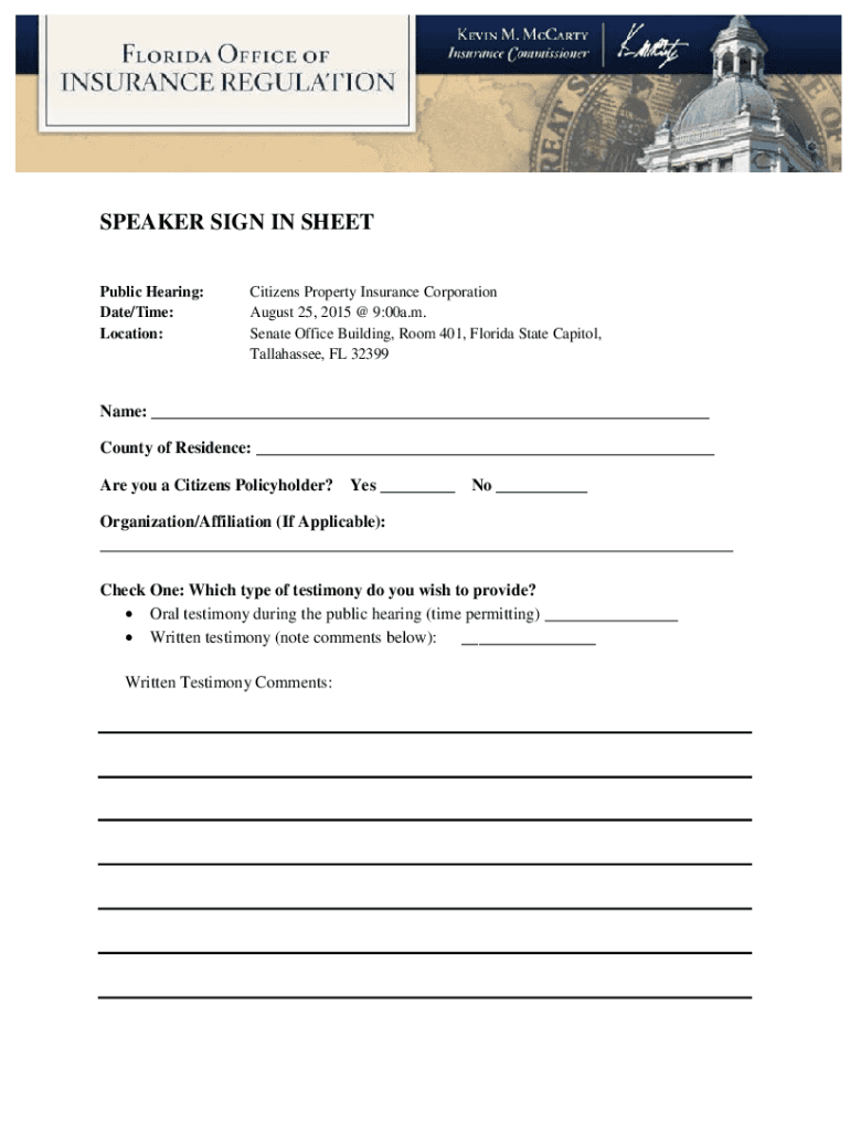 SPEAKER SIGN IN SHEET Public Hearing: Date/Time: Location:Citizens Property Insurance Corporation August 25, 2015 @ 9:00a.m. Senate Office Building, Room 401, Florida State Capitol, Tallahassee, FL