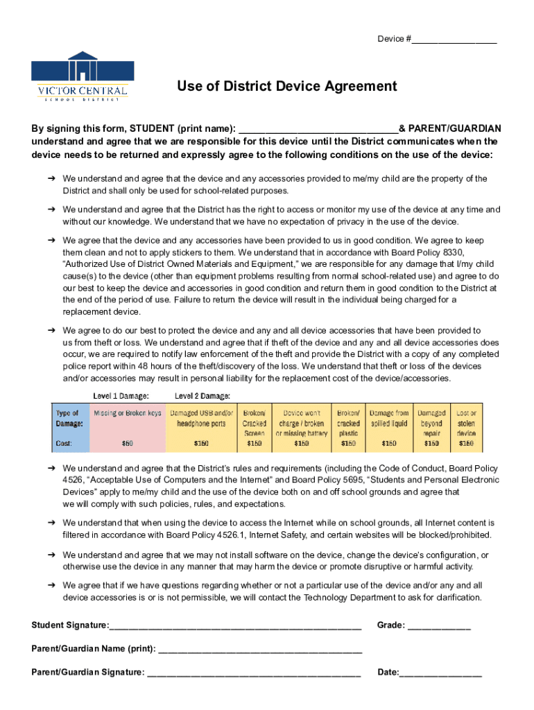 Device #___Use of District Device Agreement By signing this form, STUDENT (print name): ___& PARENT/GUARDIAN understand and agree that we are responsible for this device until the District communicates