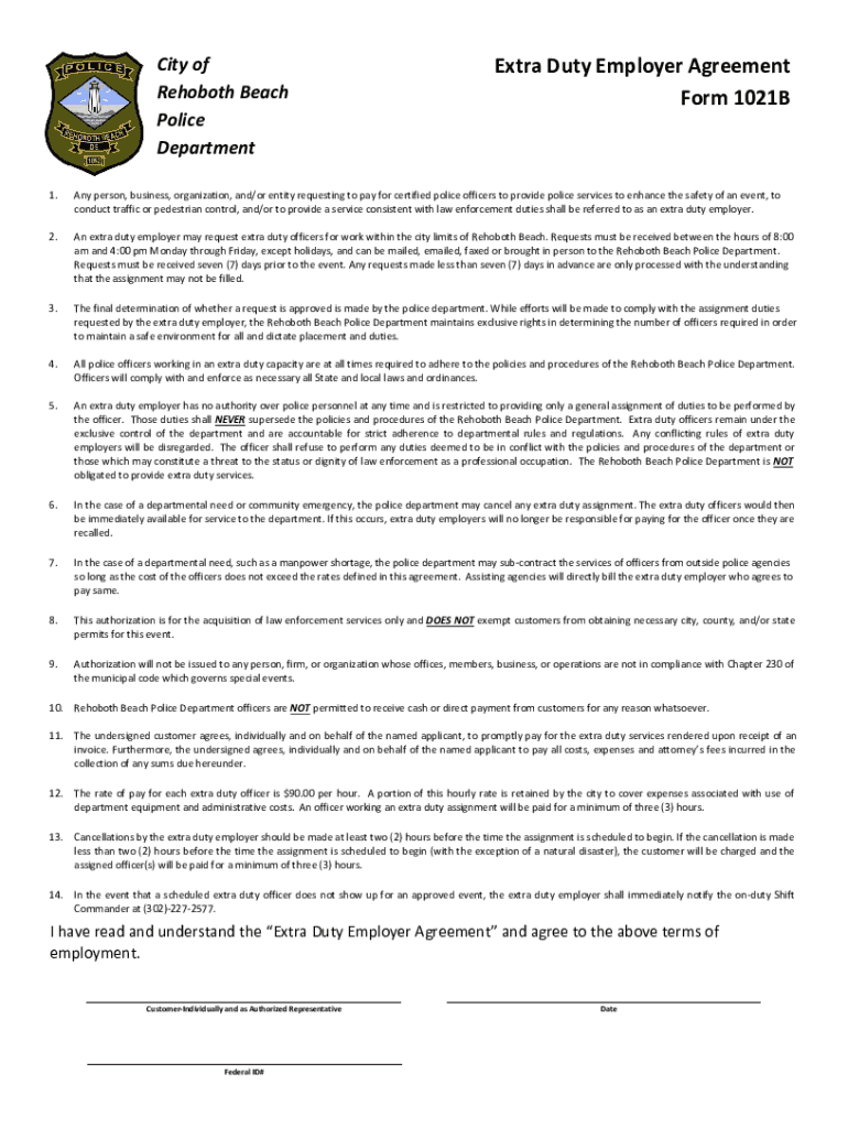 Get the free Extra Duty Employer Agreement Form 1021B