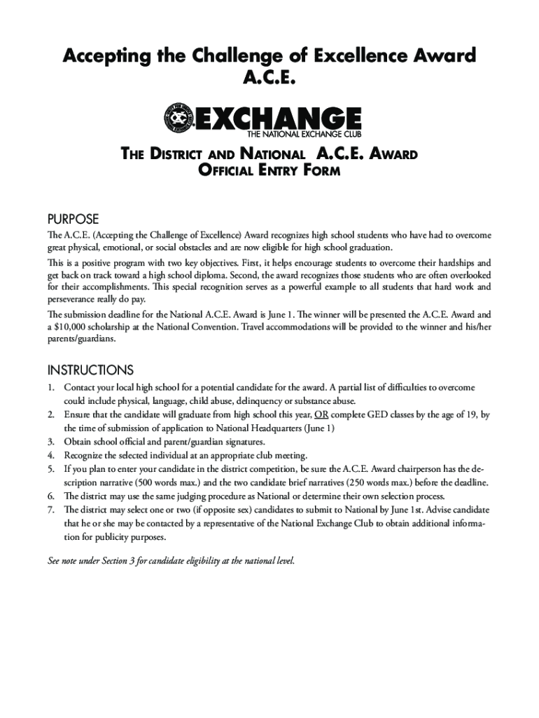 Accepting the Challenge of Excellence Award A.C.E. The District and National A.C.E. Award Official Entry Form PURPOSE The A.C.E. (Accepting the Challenge of Excellence) Award recognizes high school