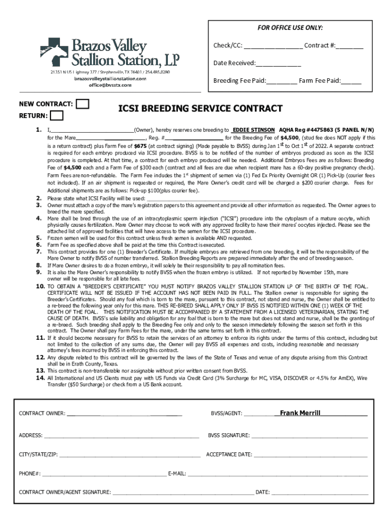 FOR OFFICE USE ONLY: Check/CC: ___ Contract #:___ Date Received:___ Breeding Fee Paid:___ Farm Fee Paid:___ NEW CONTRACT: RETURN: 1.2. 3. 4. 5. 6. 7. 8. 9.CSI BREEDING SERVICE CONTRACT, ___(Owner),
