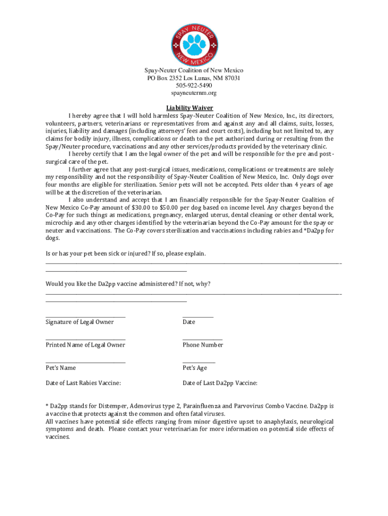 SpayNeuter Coalition of New Mexico PO Box 2352 Los Luna's, NM 87031 5059225490 spayneuternm.org Liability Waiver I hereby agree that I will hold harmless SpayNeuter Coalition of New Mexico, Inc.,