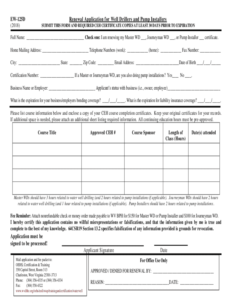 EW125D (2018)Renewal Application for Well Drillers and Pump Installers SUBMIT THIS FORM AND REQUIRED CEA CERTIFICATE COPIES AT LEAST 30 DAYS PRIOR TO EXPIRATIONFull Name: ___ Check one: I am renewing
