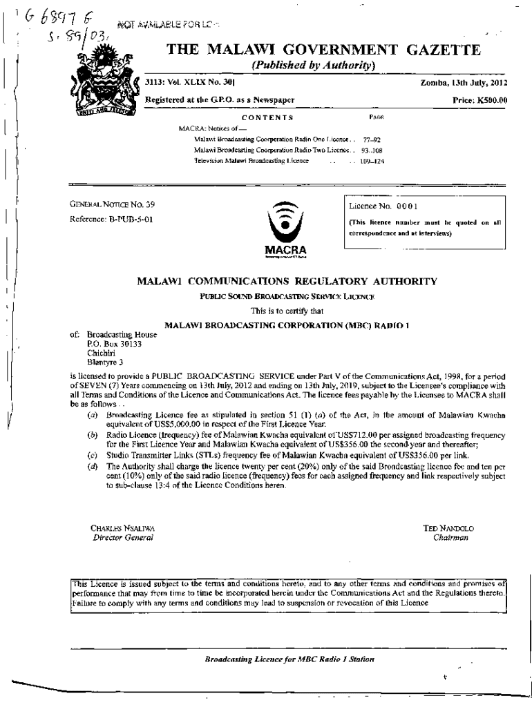 JO Available FOR THE MALAWI GOVERNMENT GAZETTE (Published by Authority) 3113: Vol. LIX No. 30]Zorn BA, 13th July, 2012Registered at the GP. O. as a Newspaper Price: K500.00 PageCONTENTSMACRA: Notices