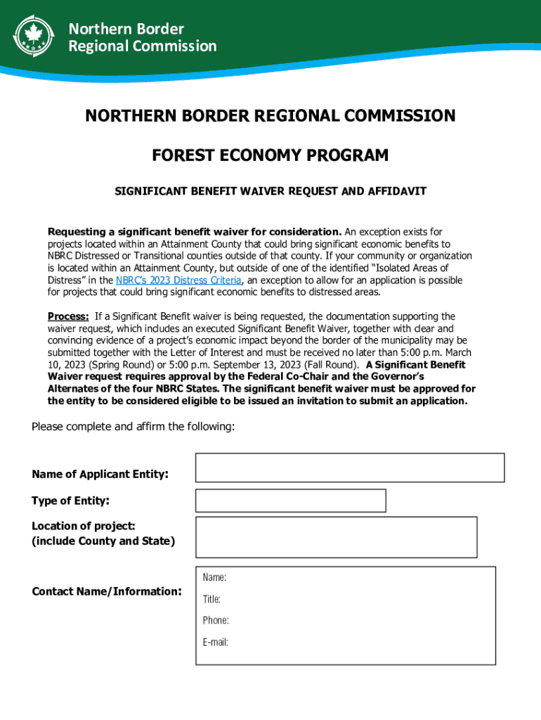 Northern Border Regional CommissionNORTHERN BORDER REGIONAL COMMISSION FOREST ECONOMY PROGRAM SIGNIFICANT BENEFIT WAIVER REQUEST AND AFFIDAVIT Requesting a significant benefit waiver for consideration.