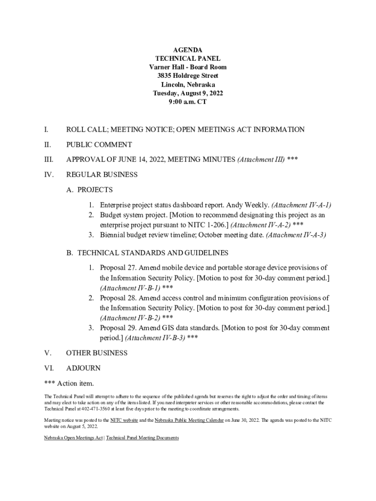 AGENDA TECHNICAL PANEL Warner Hall Board Room 3835 College Street Lincoln, Nebraska Tuesday, August 9, 2022 9:00 a.m. CTI.ROLL CALL; MEETING NOTICE; OPEN MEETINGS ACT INFORMATION.PUBLIC COMMENTING.APPROVAL
