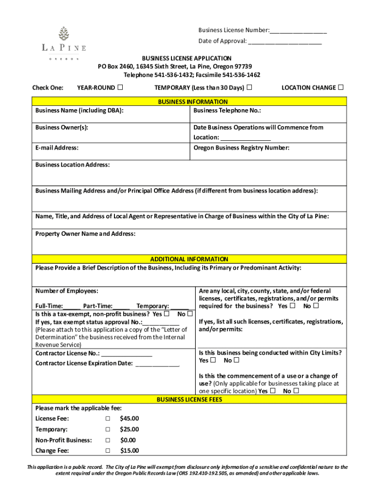Business License Number:___ Date of Approval: ___ BUSINESS LICENSE APPLICATION PO Box 2460, 16345 Sixth Street, La Pine, Oregon 97739 Telephone 5415361432; Facsimile 5415361462 Check One:YEARROUNDBusiness