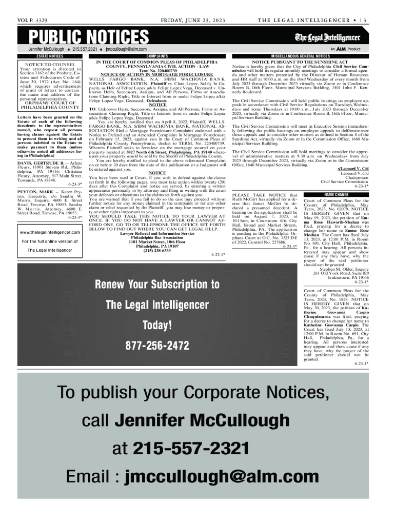 VOL P. 3329F R I DAY, J UN E 2 3, 2 0 2 3THE LEGAL INTELLIGENCE 13PUBLIC NOTICES Jennifer McCullough215.557.2321ESTATE NOTICESNOTICE TO COUNSEL Your attention is directed to Section 3162 of the Probate,