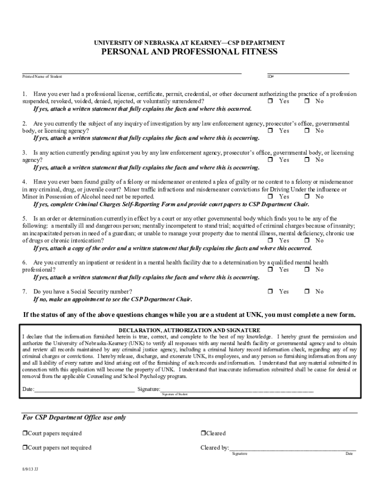 UNIVERSITY OF NEBRASKA AT KEARNEY DEPARTMENTPERSONAL AND PROFESSIONAL FITNESS___ Printed Name of Student___ ID#1. Have you ever had a professional license, certificate, permit, credential, or other