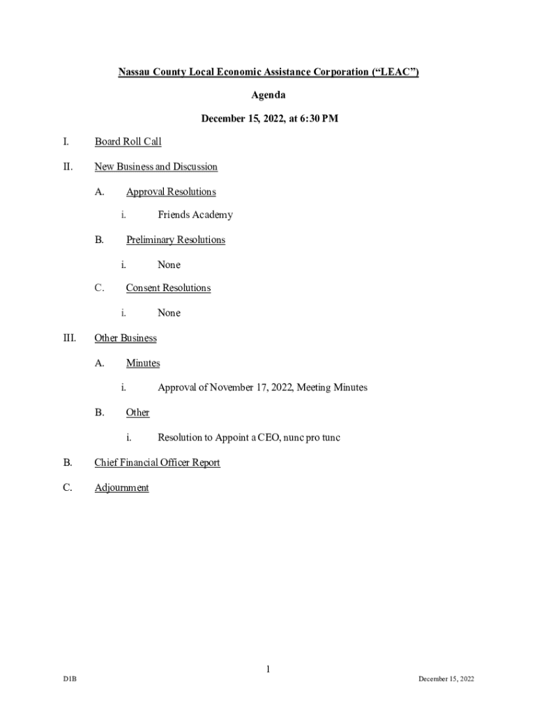 Nassau County Local Economic Assistance Corporation (LEAD) Agenda December 15, 2022, at 6:30 PM I. Board Roll Callie. New Business and Discussion A. Approval Resolutions i.B. Friends Academy Preliminary