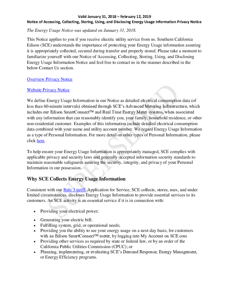 Valid January 31, 2018, February 12, 2019, Notice of Accessing, Collecting, Storing, Using, and Disclosing Energy Usage Information Privacy Notice Energy Usage Notice was updated on January 31, 2018.