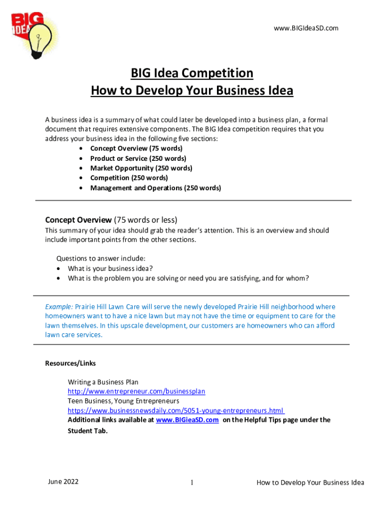 WWW. Bighead.combing Idea Competition How to Develop Your Business Idea A business idea is a summary of what could later be developed into a business plan, a formal document that requires extensive