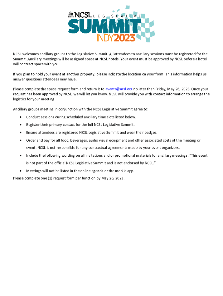 CSL welcomes ancillary groups to the Legislative Summit. All attendees to ancillary sessions must be registered for the Summit. Ancillary meetings will be assigned space at CSL hotels. Your event