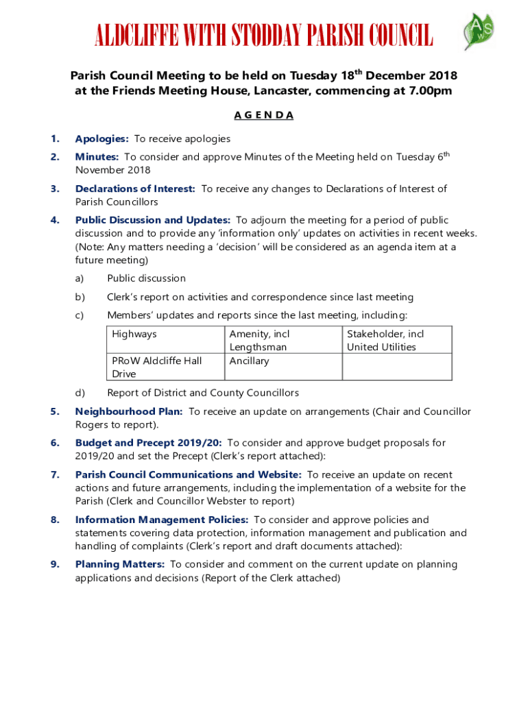 RADCLIFFE WITH TODAY PARISH COUNCIL Meeting to be held on Tuesday 18th December 2018 at the Friends Meeting House, Lancaster, commencing at 7.00pm AGENDA 1. Apologies: To receive apologies2. Minutes: