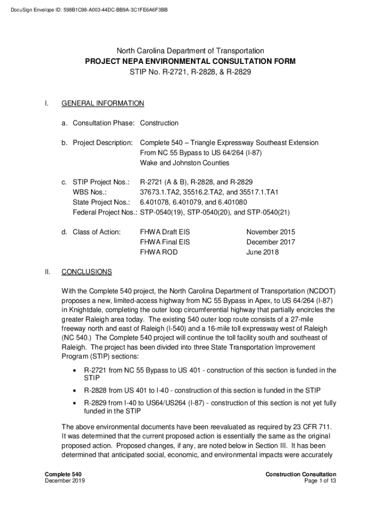 DocuSign Envelope ID: 598B1C98A00344DCBB9A3C1FE6A6F3BBNorth Carolina Department of Transportation PROJECT NEPAL ENVIRONMENTAL CONSULTATION FORMS TIP No. R2721, R2828, & R2829I.GENERAL INFORMATION