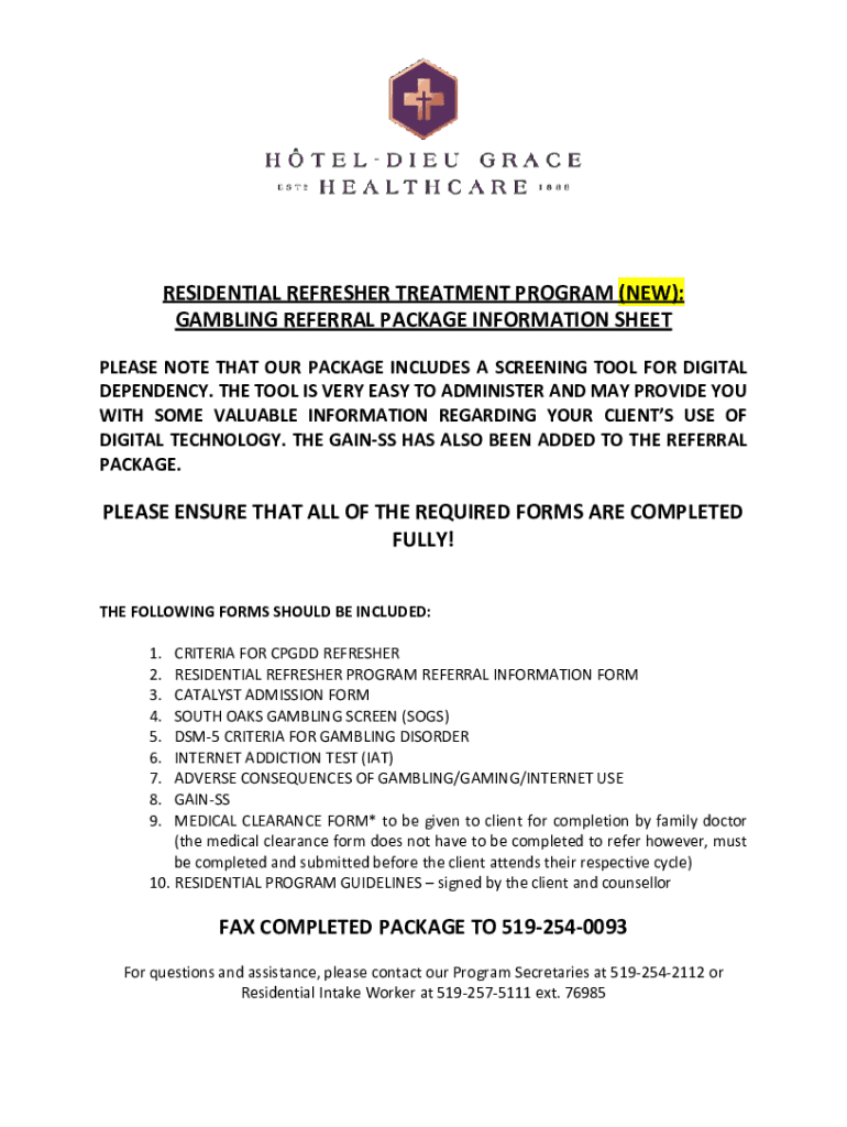 RESIDENTIAL REFRESHER TREATMENT PROGRAM (NEW): GAMBLING REFERRAL PACKAGE INFORMATION SHEET PLEASE NOTE THAT OUR PACKAGE INCLUDES A SCREENING TOOL FOR DIGITAL DEPENDENCY. THE TOOL IS VERY EASY TO ADMINISTER