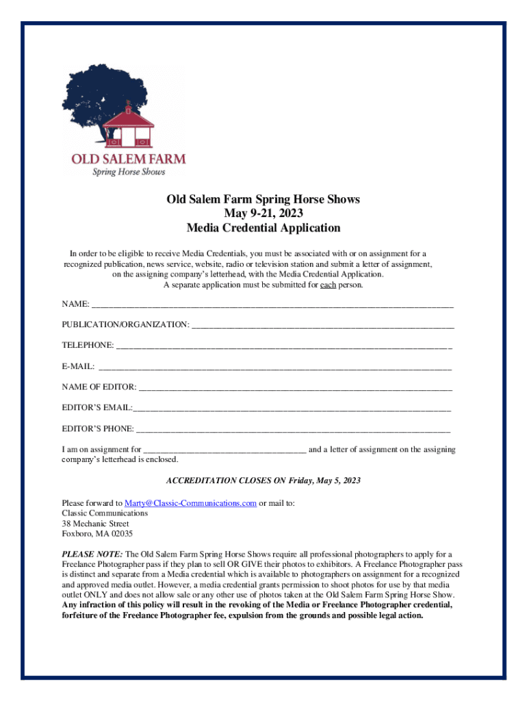Old Salem Farm Spring Horse Shows May 921, 2023 Media Credential Application In order to be eligible to receive Media Credentials, you must be associated with or on assignment for a recognized publication,