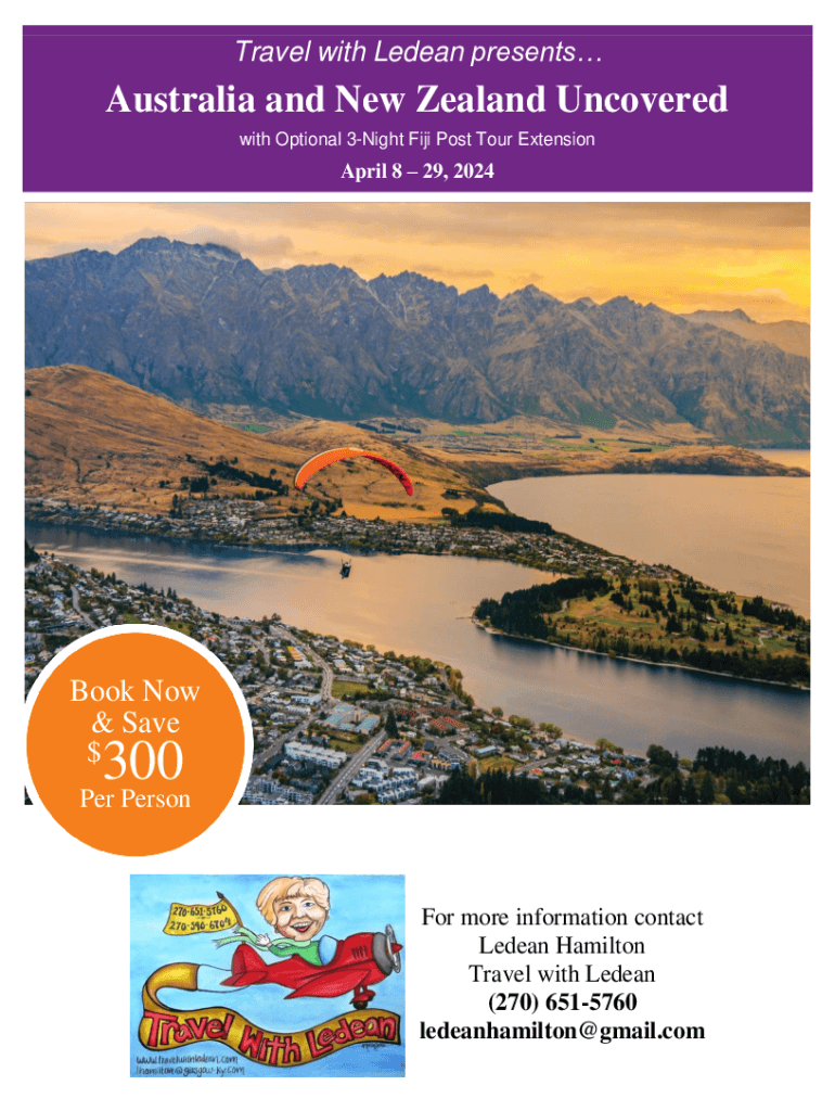 Travel with Le dean presents Australia and New Zealand Uncovered with Optional 3Night Fiji Post Tour Extension April 8 29, 2024Book Now & Save $300Per Person more information contact Le dean Hamilton