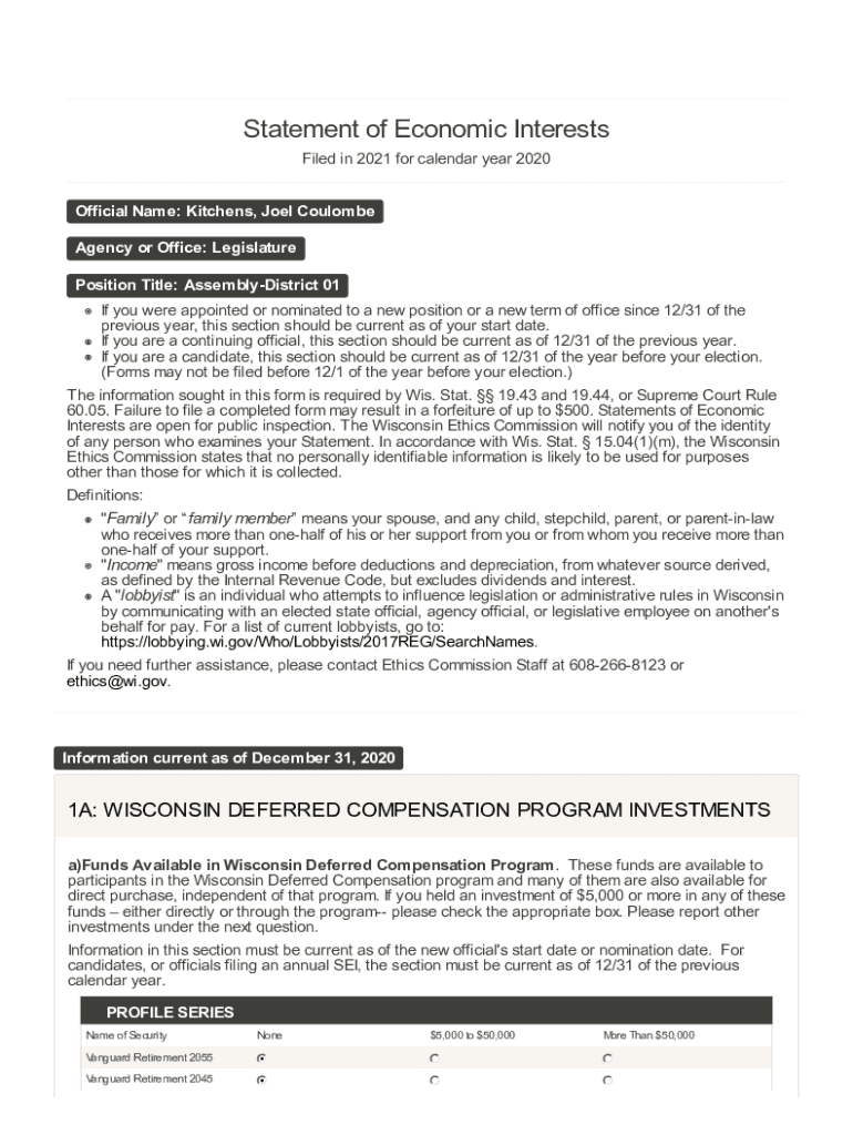 Statement of Economic Interests Filed in 2021 for calendar year 2020 Official Name: Kitchens, Joel Coulomb Agency or Office: Legislature Position Title: AssemblyDistrict 01 If you were appointed or