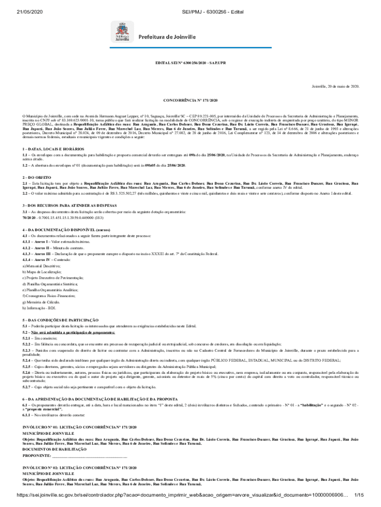 21/05/2020SEI/PM 6300256 EditalEDITAL SET N 6300256/2020 SAP. Joinville, 20 DE main DE 2020.CONCORDIA N 171/2020O Municipal de Joinville, com see Na Agenda Hermann August Pepper, n 10, Saga, Joinville/SC