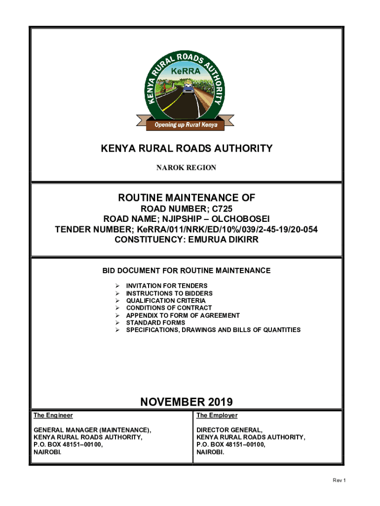 KENYA RURAL ROADS AUTHORITY NARK REGIONROUTINE MAINTENANCE OF ROAD NUMBER; C725 ROAD NAME; AIRSHIP OLCHOBOSEI TENDER NUMBER; Kerry/011/NRL/ED/10%/039/24519/20054 CONSTITUENCY: EMU RUA DIKING BID DOCUMENT