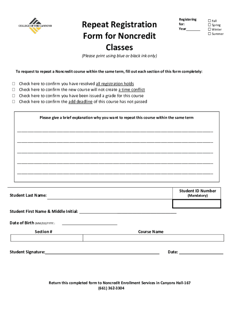 Registering for: YearRepeat Registration Form for Noncredit Classes Fall Spring Winter Summer(Please print using blue or black ink only)To request to repeat a Noncredit course within the same term,