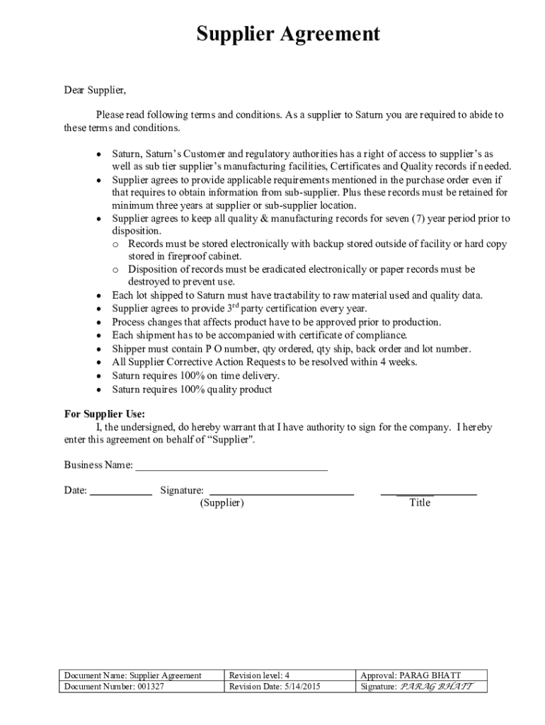 Supplier Agreement Dear Supplier, Please read following terms and conditions. As a supplier to Saturn you are required to abide to these terms and conditions. Saturn, Saturn's Customer and regulatory