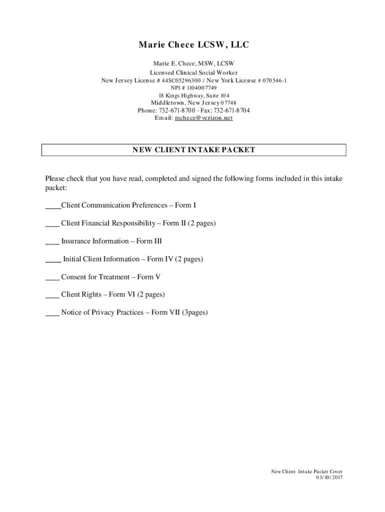 Marie Check LCSW, LLC Marie E. Check, MSW, LCSW Licensed Clinical Social Worker New Jersey License # 44SC05296300 / New York License # 0705461 NPI # 1104007749 18 Kings Highway, Suite 104 Middletown,