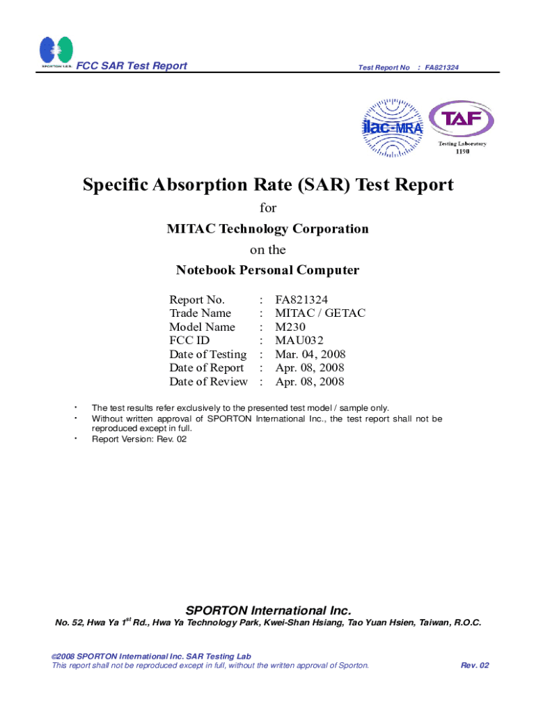 FCC SAR Test Reported Report No: FA821324Specific Absorption Rate (SAR) Test Report
