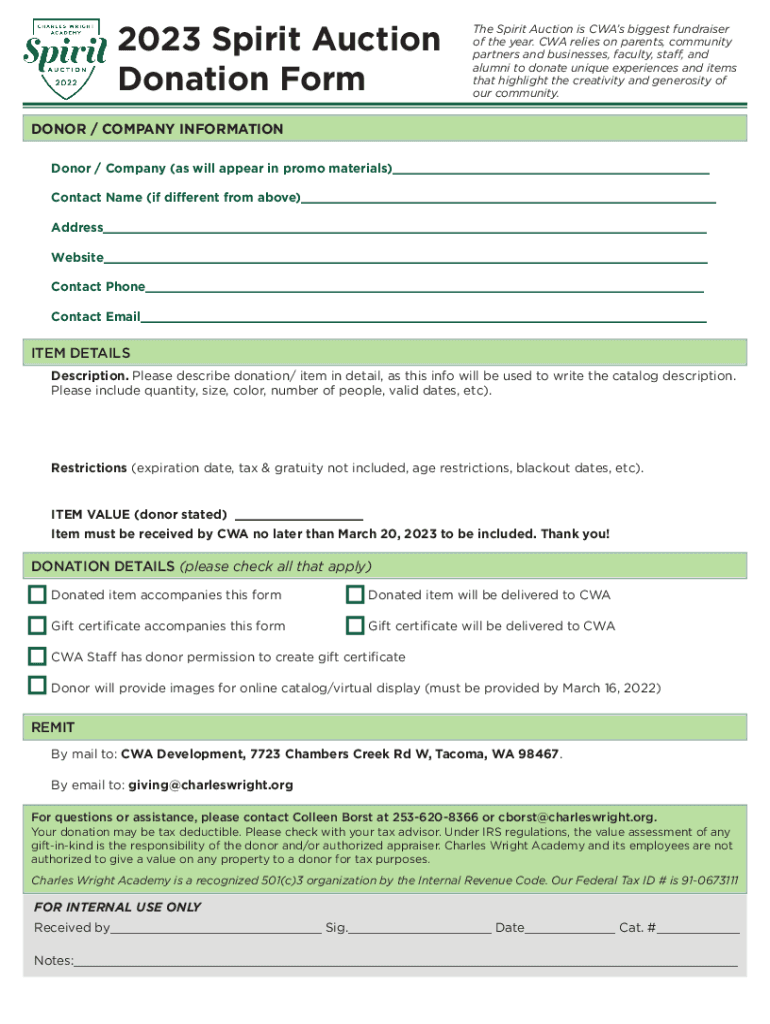 2023 Spirit Auction Donation Forth Spirit Auction is CWA's the biggest fundraiser of the year. CWA relies on parents, community partners and businesses, faculty, staff, and alumni to donate unique