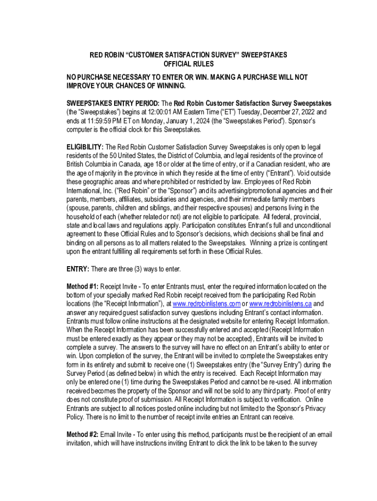 RED ROBIN CUSTOMER SATISFACTION SURVEY SWEEPSTAKES OFFICIAL RULES NO PURCHASE NECESSARY TO ENTER OR WIN. MAKING A PURCHASE WILL NOT IMPROVE YOUR CHANCES OF WINNING. SWEEPSTAKES ENTRY PERIOD: The Red