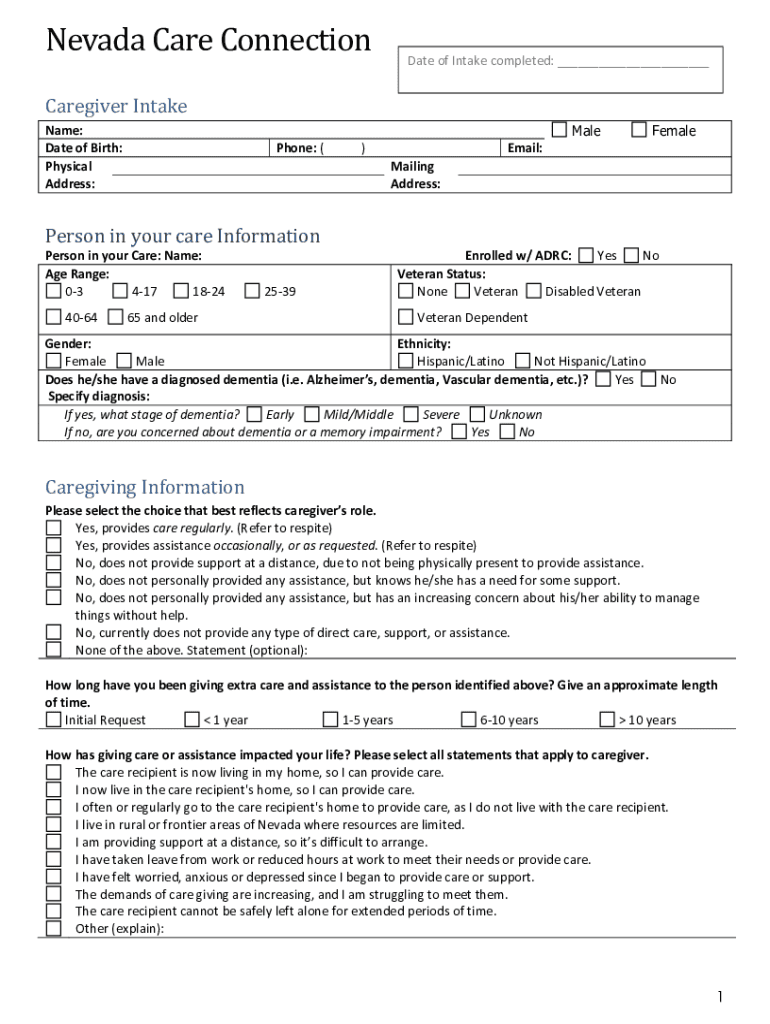 Nevada Care Connection Caregiver Intake Name: Date of Birth: Physical Address:Phone: (Person in your care Information Person in your Care: Name: Age Range: 03 417 1824 406465 and older2539)Date of