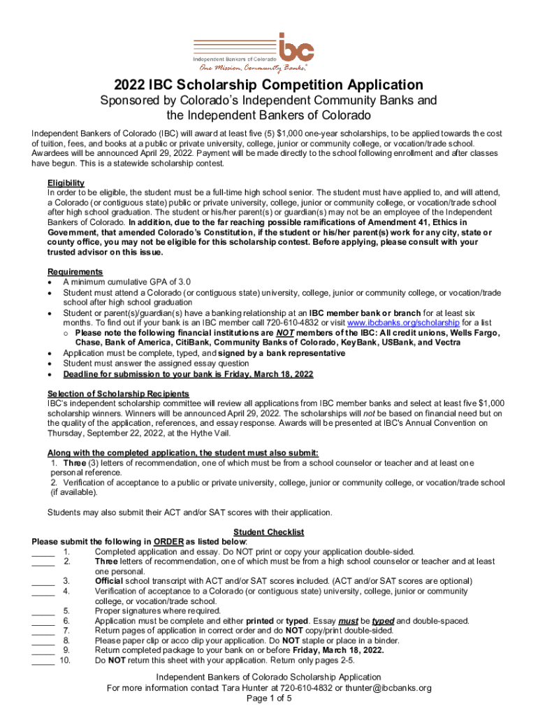 2022 IBC Scholarship Competition ApplicationSponsored by Colorado's Independent Community Banks and the Independent Bankers of Colorado Independent Bankers of Colorado (IBC) will award at least five