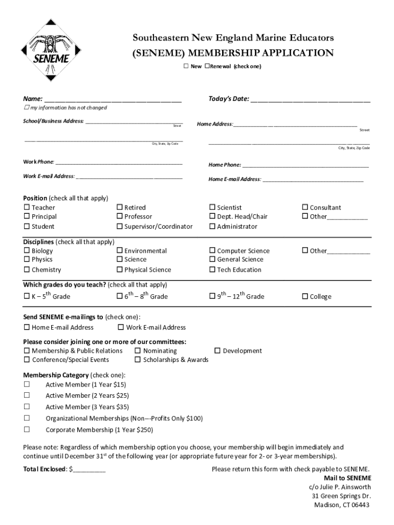 Southeastern New England Marine Educators (SEN EME) MEMBERSHIP APPLICATION New Renewal (check one)Name: ___Today's Date: ___ my information has not changed School/Business Address: ___ Streetwise